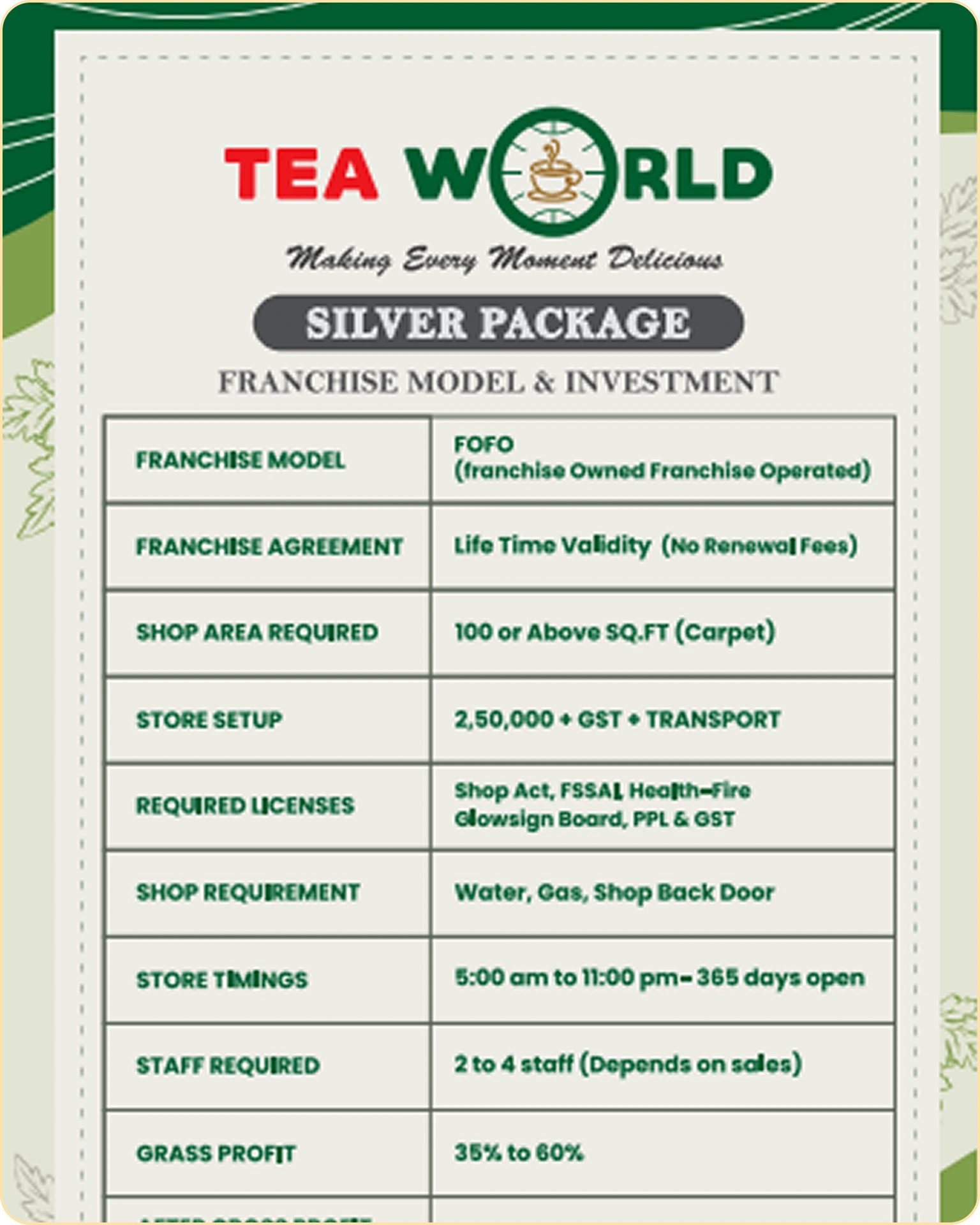 Whether you’re starting your first business or expanding your portfolio, Namma Tea World offers franchise plans designed for different investment levels and growth goals. Each brochure clearly outlines setup needs, support, and earning potential — helping you decide with confidence.